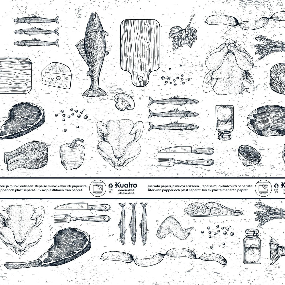 Laadukas yleispainettu lihakäärepaperi, soveltuu lihojen, kalojen ja muiden lihatuotteiden käärintään.