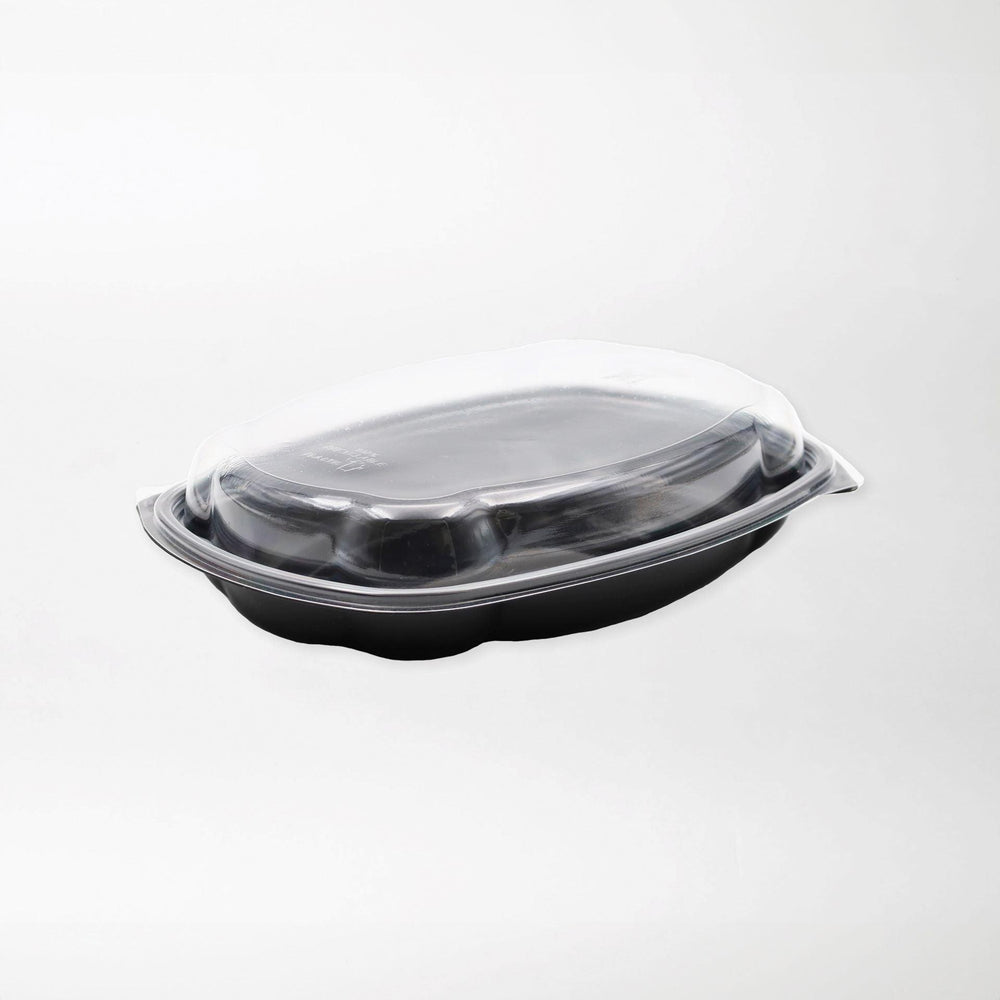 Rosty ovaalin ruokarasian pohja musta PP-muovi (850ml) + läpinäkyvä antifog kansi OPS-muovi (240kpl/ltk)